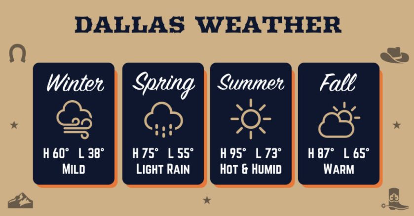 In regards to weather condition, these are the typical low and high normal for Dallas. Dallas summer seasons are clammy and hot, however temperature levels seldom exceed 102 °. Winters are windy and cold, however you most likely will not see temperatures drop listed below 25 °. Bottom line: you’re going to sweat in the summer season, however the winter seasons will bring the chill without freezing you out excessive.